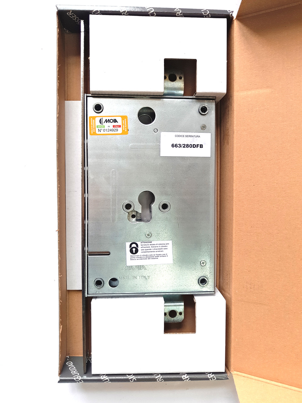 Додатковий дверний замок MOIA 763/280DFB — протизламний, універсальний (підходить на ліві та праві двері), врізного типу, п'ятиригельний, EuroDin стандарту, призначений для встановлення на вхідні металеві двері, а також може, встановлений на ящики, сейфи, калітки.