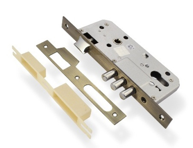 Врізний замок 1700-AB від Apecs призначений для монтування у вхідних дерев'яних дверях. Замок має віддалення ключового отвору в 45 мм, і 2-х сантиметровий виліт трьох циліндричних ригелів діаметром 12 мм