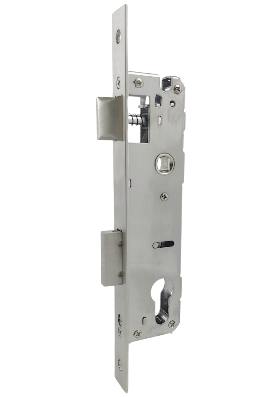 Врізний замок для дверей із посадковим розміром 28х85 мм. Автоматичне замикання — на косий ригель. Також може бути примусове замикання на прямий ригель — рухом "ручка вгору".