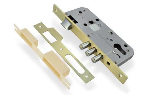 Врізний замк 1700-GM від Apecs призначений для монтування у вхідних дерев'яних дверях. Замок має віддалення ключового отвору в 45 мм, і 2-х сантиметровий виліт трьох циліндричних ригелів діаметром 12 мм