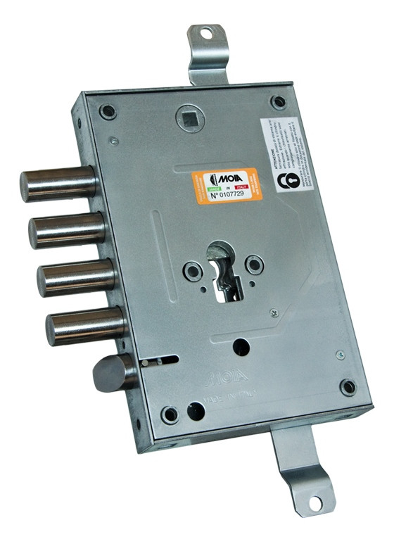 MOIA E654/280DF_ind – основний врізний універсальний (підходить на праві і ліві двері) четырехригельный замок високого ступеня взломостойкості.