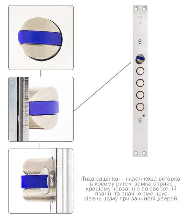 «Тиха клямка» – пластикова вставка в косому ригелі замку, яка сприяє кращому ковзанню зворотної планки і значно зменшує рівень шуму при закриванні дверей.
