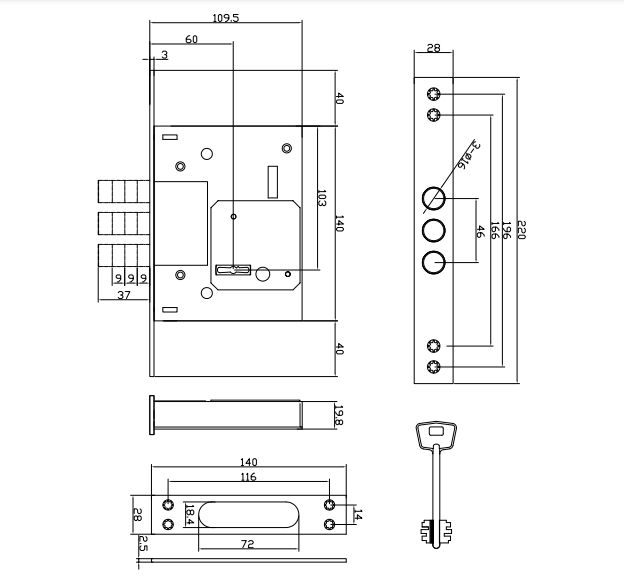 - Тип ключа — сувальдний, довжина 110,6 мм.