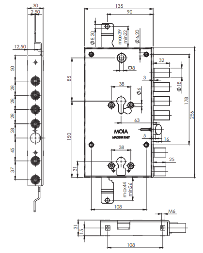 Основний двосистемний дверний замок MOIA 6654/280DFB/S2 - протизламний, універсальний (підходить на ліві і праві двері), врізного типу, шестиригельный, стандарту EuroDin, призначений для установки на вхідні металеві двері, а так само може, встановлений на ящики, сейфи, хвіртки.