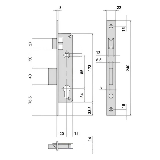 У відкритому стані фіксується за допомогою язичка. Він реверсивний, тому замок можна встановити як у лівосторонні, так і в правосторонні дверні полотна. Замок замикається одним прямокутним ригелем завтовшки 8,5 мм.