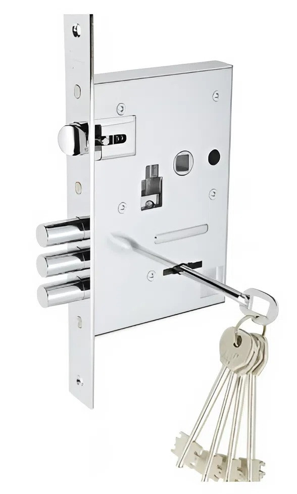 Корпус замка виготовлений з міцного металу і оснащений трьома сталевими круглими ригелями діаметром 11,5 мм з максимальним виходом 21 мм, що забезпечує захист від злому. Замок керується ручкою та сувальдним ключем, має реверсивний сталевий язичок з гальванічним покриттям, завдяки чому підходить для встановлення як на праві, так і на ліві двері.