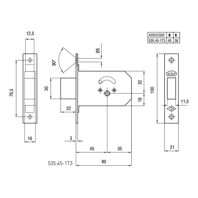 Замок DAF 535-45-1T-ST-3 призначений для встановлення на вхідні дерев'яні та металеві двері. Оснащений одним прямокутним багатошаровим ригелем з виходом 22 мм. Керування здійснюється хрестоподібним ключем, у комплекті — 3 ключі.